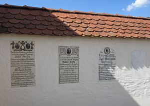 Im Torturm des Friedhofs ist eine Gedenktafel für die Gefallenen des 1. Weltkriegs. Die vier Familien aus Landerzhofen stifteten Gedenktafeln für ihre gefallenen Söhne. Eine davon ist leider nicht mehr lesbar.