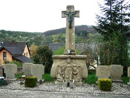 Sandsteinkreuz mit bildlicher Darstellung von Soldat und Zivilperson in Halbrelief, in der Mitte