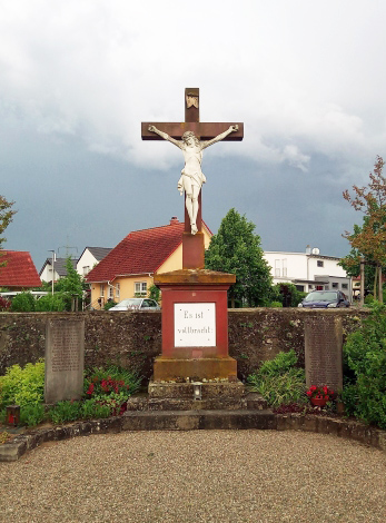 Steinkreuz mit Figur auf einem vierstufigen Sockel, daneben zwei Gedenksteine, im Friedhof.
