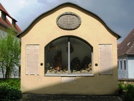 Kleine Gedächtniskapelle an der Dorfstraße. Die Opfer sind auf in die Wand eingelassenen Steinplatten verzeichnet.