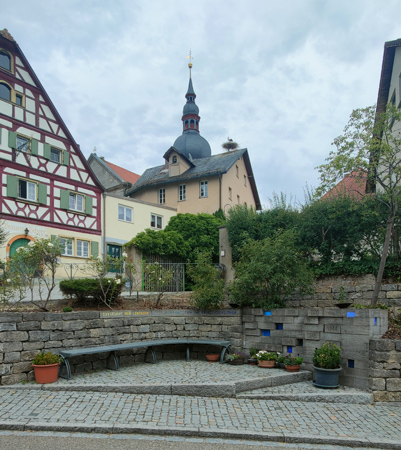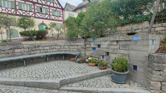 Am Marktplatz eine halbrund angelegte Mauer mit Steinblöcken, in die Jahreszahlen (hervorstehend)