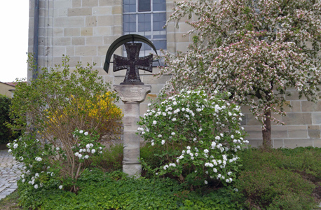 Vor der evangelischen Pfarrkirche St. Oswald steht auf einem Sandsteinsockel ein Nagelkreuz.
