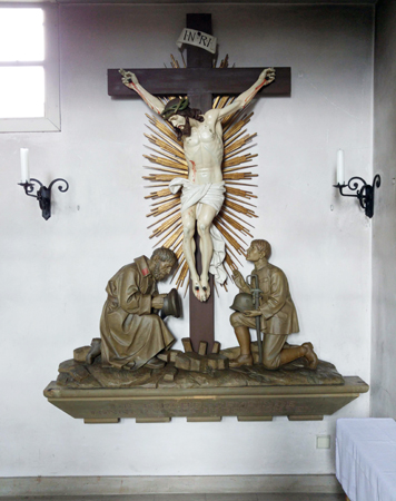 In der Kirche befindet sich die Darstellung zweier Soldaten, die vor dem Gekreuzigten knien. Am Sockel steht eine Inschrift.