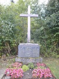 Holzkreuz, darunter eine Gedenkplatte aus Marmor