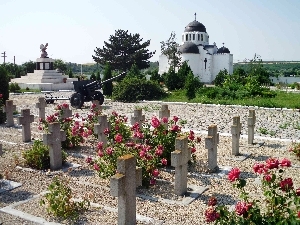 Kriegsgräberstätte für Gefallene des 1. Weltkriegs aus Deutschland, Österreich-Ungarn, Rumänien und anderen Nationen. Kirche mit dahinterliegendem Friedhof, unterteilt in vier Blöcke mit zentralem Denkmal gekrönt von einem Adler, umringt von vier Kanonen