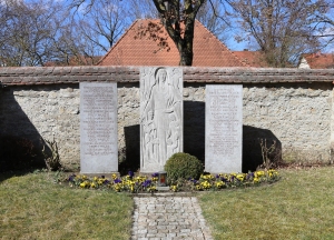 Denkmal vor der Kirche St. Georg am Zugang zum Friedhof: Zwischen zwei Stelen mit den Namen und Lebensdaten der Gefallenen und Vermissten beider Weltkrieg eine weitere Stele mit der Darstellung Mariens, die ihren Mantel ausbreitet, unter dem Bedürftige Schutz suchen. Die Geburts- und Todesdaten für die Gefallenen des 1. Weltkrieges stammen von den beiden Gedenktafeln, die in der Kirche angebracht sind.