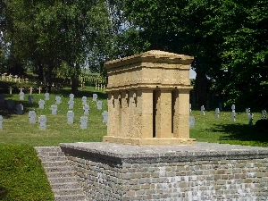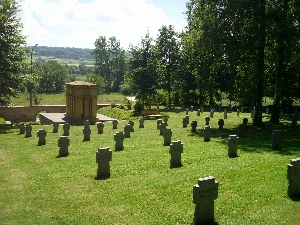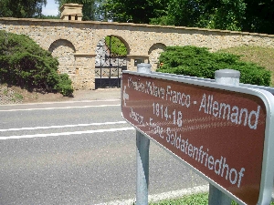 Kriegsgräberstätte für deutsche und französische Gefallene des 1. Weltkriegs, an einem Hang ein Eingangstor mit Treppenaufgang zu einem kleinen Tempel, im vorderen Bereich die deutschen Gräber, darüber die französischen Gräber