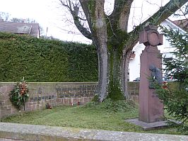 Sandsteinsäule mit Kreuz und sitzender Frauenfigur. Um die Säule herum befindet sich eine Sandsteinmauer an der Namenstafeln angebracht sind.