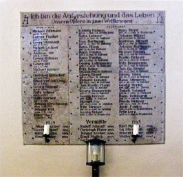 Gedenktafeln für einen Gefallenen des Feldzugs 1870/71 sowie für beide Weltkriege in der Kirche. Ein Kriegsgrab sowie Ergänzungen von Einzelgedenken auf Privatgräbern.