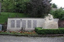 Bei der Kirche; Wand mit Gedenktafeln, davor auf einem Sockel Steinplastik "Jesus segnet