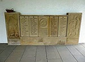 In der offenen Aussegnungshalle stehen vor den Wänden die Kriegerdenkmäler. 1. Weltkrieg: Zwischen zwei Steinbildnissen (Abschied eines Soldaten und Trauer zweier Soldaten am Grab eines Kameraden) vier Namenstafeln und eine Inschriftentafel, 2. Weltkrieg: Sechs Namenstafeln auf einem Sockel. Das von dem Maler, Bildhauer und Schmuckdesigner Franz Boeres (1872 - 1956) gestaltete Denkmal für die Gefallenen, Verstorbenen und Vermissten des Ersten Weltkriegs hatte ursprünglich eine erhöhte Lage an der Friedhofmauer, wie ein Tempel oder Opferplatz. In den siebziger Jahren hat man es in die Vorhalle der Trauerkapelle versetzt, um es vor weiterer Verwitterung zu schützen.