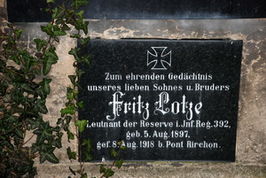 Zum ehrenden Gedächtnis unseres lieben Sohnes u. Bruders Fritz Lotze Leutnant der Reserve i. Inf. Reg. 392 geb. 5. Aug. 1897 gef. 8. Aug. 1918 b. Pont Rirchon