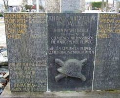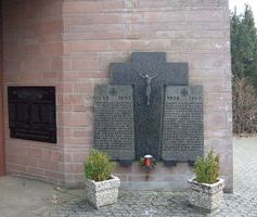 Ausführung), darunter Inschrift. a) und b) am Eingang der Aussegnungshalle in Wandmontage
