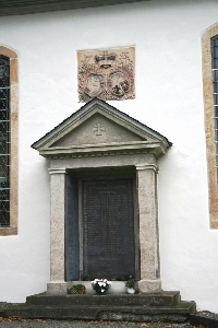 Portal an der Nordseite der ev.-luth. St. Lorenzkirche, an Stelle des Türblattes die Tafel für den 1. Weltkrieg, die beiden Seitenwände sind mit je einer Tafel für den 2. Weltkrieg versehen.