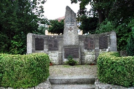 Mahnmal in der Lindenstraße (L 1104) Richtung südlicher Ortsausgang auf Höhe Haus-Nr. 20 A. Stele mit zwei Widmungen. Je zwei Tafeln mit den Namen der Opfer des 2. Weltkrieges auf den Seitenflügeln.