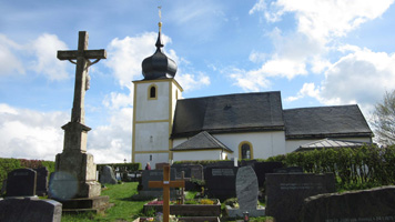 Vom Tatzenkreuz gekröntes Steindenkmal bei der Vexierkapelle St. Nikolaus. Ergänzende Angaben von Einzelgedenken auf Privatgräbern.