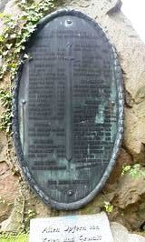 Einzeln stehender Findling mit Plakette auf dem örtlichen Kirchhof