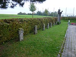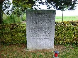 Gedenkstein mit herausgearbeiteten Namen Daneben befinden sich kleine Steinkreuze sowie ein großes Kreuz