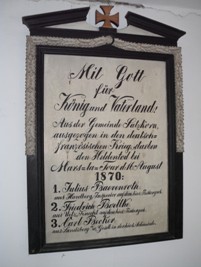 Tafel 1870: Mit Gott für König und Vaterland. Aus der Gemeinde Satzkorn ausgezogen