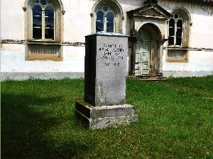 Gedenkstein aus Beton vor der Kirche von Seerhausen.