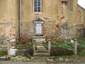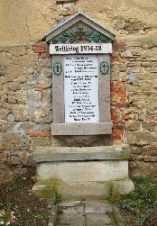 Denkmal an der südlichen Außenwand der ev.-luth. Dorfkirche. Die nicht mehr lesbaren Namen der Opfer des 1. Weltkriegs wurden offenbar 2017 durch eine Tafel, die auch die Namen der Opfer des 2. Weltkriegs enthält, abgedeckt