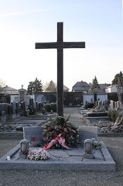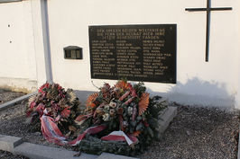 An zwei Orten im Friedhof Kriegsgräber: Hochkreuz mit zwei Marmortafeln (ohne Namen) und Gedenktafel an der Friedhofsmauer (mit Namen).