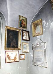In der Friedhofskapelle; mehrere Tafeln an der Wand.