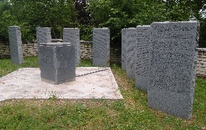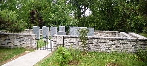 Kriegsgräberstätte für Deutsche Gefallenen des 2. Weltkriegs im Stadtpark von Tirana. Kleine ummauerte Anlage mit aufgerichteten Granitplatten mit den Namen
