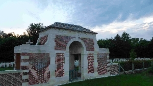 Vieux-Berquin (britische Kriegsgräberstätte Aval Wood), Arrondissement Dunkerque, Departement du Nord, FrankreichPLZ 59232 Britische Kriegsgräberstätte mit einem deutschen Grab