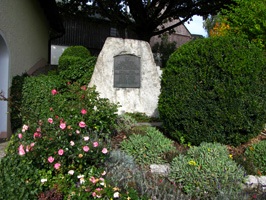Die Gedenktafel für die Gefallenen beider Weltkriege ist auf einem Naturstein angebracht, der neben dem Feuerwehrhaus steht.