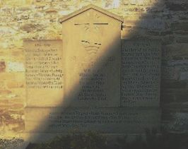 Auf der Innenseite der Friedhofsmauer sind Namenstafeln eingefügt (teilweise verwittert). Außerdem