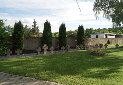 An der äußeren Friedhofsmauer sind in mehreren Gruppen Steinkreuze aufgestellt.