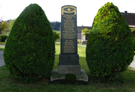 Eine schwarze Granitsäule mit goldener Schrift erinnert an die Opfer beider Weltkriege.