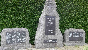 Denkmal für die Gefallenen des 1. und 2. Weltkriegs. Mittlerer hoher Felsblock mit Widmung und seitliche Felsblöcke mit Namenstafeln