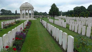 Die britische Kriegsgräberstätte Bedford House liegt direkt am südlichen Stadtrand von Ypern an der Straße N336. Es ist eine sehr schöne Anlage, die von mehreren Teichen durchzogen wird, die das Gelände unterteilen. Der deutsche Fliegerleutnant ist in dieser großen Kriegsgräberstätte schwer zu finden.