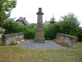 In einer Grünanlage befindet sich das Kriegerdenkmal. In der Mitte eine Steinstele mit einem deutschen Kreuz als Abschluss. An der Seite ein Lorbeerkranz, darin ein Stahlhelm. An drei Seiten sind Namen eingemeißelt dazwischen ein nach unten zeigendes Schwert. In zwei freistehenden Mauern sind zwei Steinplatten, in Form eines deutschen Kreuzes, mit Inschriften, sowie vier Namenstafeln eingefügt.
