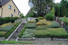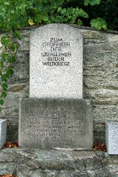 Denkmalanlage am Nordhang neben der Durchgangsstraße (L 1098). Sockel mit den Namen offensichtlich
