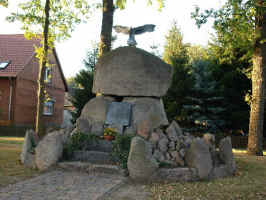 An der Hauptstraße: ein Denkmal aus aufgetürmten Findlingen, umgeben von aufgestellten Steinen,