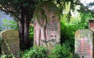 Neben der Kirche steht ein Ensemble von Gedenksteinen für die beiden Weltkriege: Drei behauene