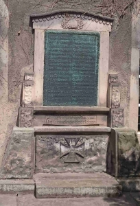 Denkmal für die Gefallenen des 1. Weltkriegs an der Kirchen Außenwand mit eingelassener Metall Namenstafel; Gedenken auf Familiengräbern; Soldatengrab