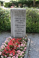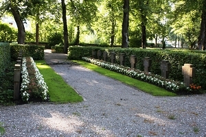 Im Friedhof; zwei Reihen von Steinkreuzen, an anderen Stellen im Friedhof zwei einzelnen Kriegsgräber anderer Nationen