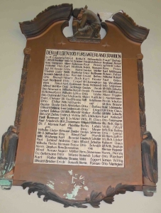 vor der Kirche (altes Grab Monument mit angebrachten Widmungstafeln); Gedenktafel 1. Weltkrieg in der Kirche mit trauernder