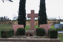Im Friedhof: Denkmal, dreiteilig, in der Mitte Kreuz, Inschrift am Sockel, seitlich davon je ein Namensstein.