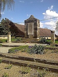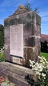 Neben der Kirche Denkmal für die Gefallenen des 1. Weltkriegs, gemauert aus Sandsteinblöcken mit eingelassener