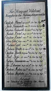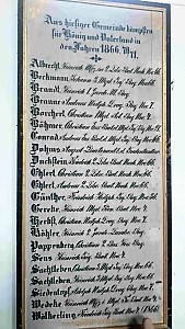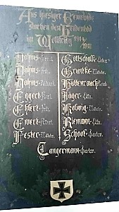 Namenstafel und gekrönt von einem Stahlhelm; Gedenktafeln in der Kirche