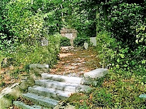Sechs Stufen führen zu einer kleinen Lichtung im Wald, mittig ein grosser rötlicher