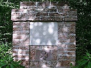 Backsteinsockel mit eingelassener Gedenkplatte (1. Weltkrieg) in weiss. Rechts und links steht je