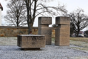 Vor dem Friedhof; Würfel auf allen Seiten mit Namen, etwas dahinter zwei stehende Steinblöcke. Der Zwischenraum hat die Form eines Kreuzes. Die Opfer des 1. Weltkriegs sind auch auf dem Denkmal vor der Kirche verzeichnet (separater Beitrag).