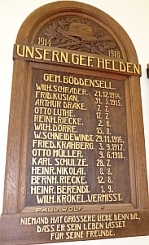 Gedenktafel: 1914 – 1918 Unsern gef. Helden Gem. Böddensell (Namen) Niemand hat größere Liebe denn die, dass er sein Leben lässet für seine Freunde
