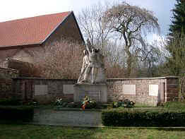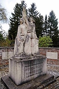 Die Tafeln für die Gefallenen des 1. Weltkriegs sind im Halbkreis aus Sandstein in eine Mauer eingelassen. Zwei Tafeln für die Opfer des 2. Welkriegs sind links und rechts aus rötlichem Marmor angebracht. In der Mitte des Halbkreises steht eine Figurengruppe aus drei Soldaten mit Inschrift. Das ganze befindet sich neben der Kirche. Gedenken auf Familiengräbern. KZ-Opfer Grab.